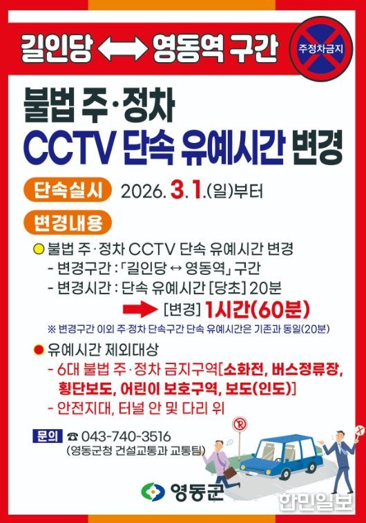 군에 따르면 3월 1일부터 『길인당↔영동역』 구간의 불법 주·정차 CCTV 단속 유예시간이 기존 20분에서 1시간(60분)으로 변경된다.