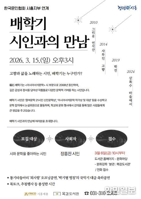 이번 만남은 3월 15일 오후 3시, 목감도서관 지하 1층 다목적실에서 진행되며, 시와 문학에 관심이 있는 50여 명의 시민과 함께한다. 시인이 직접 자신의 작품을 낭독하고, 시를 쓰게 된 계기와 창작 과정에 관한 이야기를 들려줄 예정이다. 또한, 시민들과 자유롭게 질문을 나누며 시와 삶에 대해 편안하게 대화하는 시간도 마련된다.