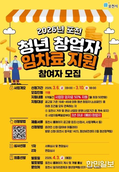 한민일보 서울포커스 심기옥 기자 | 포천시는 청년 창업자의 안정적인 창업 환경 조성과 창업 지속 가능성 제고를 위해 '2026년 청년 창업자 임차료 지원사업' 참여자를 2026년 3월 6일부터 10일까지 모집한다.