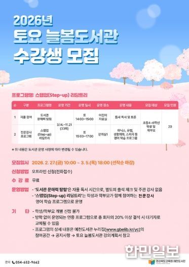 한민일보 서울포커스 임경복 기자 | 경상북도교육청 예천도서관은 지역 어린이들의 문해력 향상과 영어 학습 역량 강화를 지원하기 위해 2026년 토요 늘봄도서관 수강생을 모집한다.