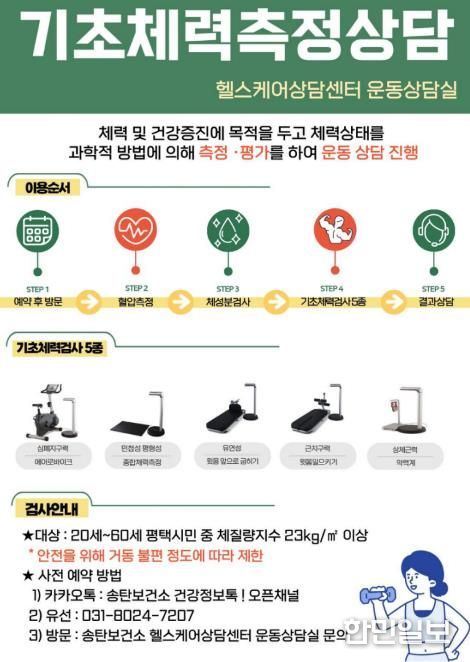 한민일보 서울포커스 황준형 기자 | 평택시 송탄보건소는 운동전문가에 의한 ‘기초체력 측정’과 ‘균형 능력 검사’를 통해 개인 맞춤형 운동 상담을 제공하는 건강증진 서비스를 연중 운영하고 있다고 밝혔다.