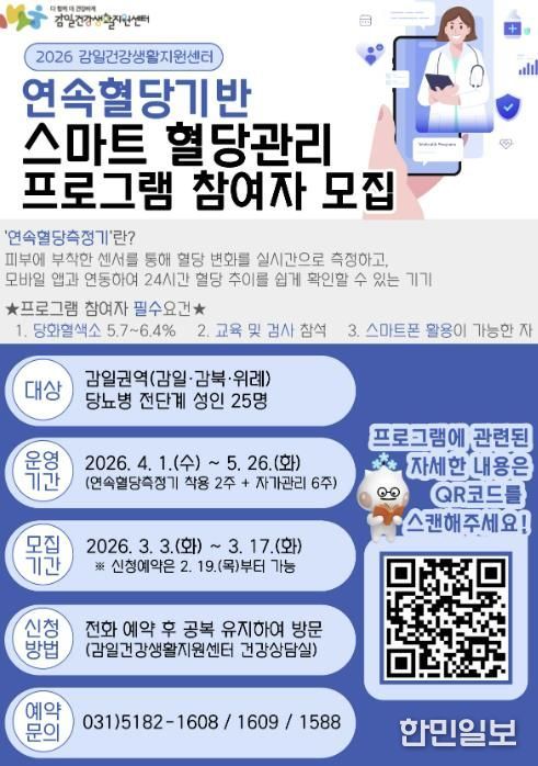 한민일보 서울포커스 유현민 기자 | 하남시 감일건강생활지원센터는 당뇨병 전단계 주민의 생활습관 개선과 자가 혈당관리를 돕기 위해 ‘연속혈당 기반 스마트 혈당관리 프로그램’을 오는 4~5월 8주간 운영한다.