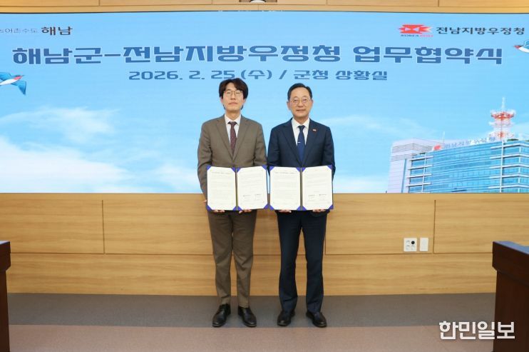 한민일보 서울포커스 박정민 기자 | 전남지방우정청(청장 김동주)은 25일 해남군청에서 해남군(군수 명현관)과 지역 농·수·축산물 판로 확대를 위한 업무 협약을 체결했다고 밝혔다.