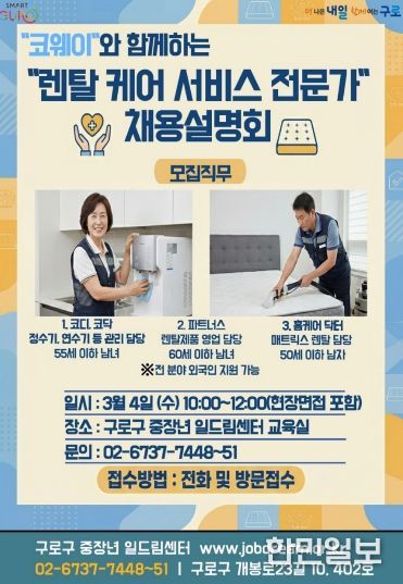 행사는 관내 기업인 코웨이와 협력해 진행되며, 렌탈 케어 서비스 분야 20명을 모집한다. 채용 직무는 코디·코닥, 파트너스, 홈케어 닥터로 구성된다.
