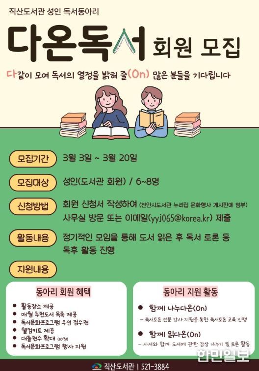 한민일보 서울포커스 황준형 기자 | 천안시 직산도서관은 내달 3~ 20일 성인 독서동아리 ‘다온독서’ 참여자를 모집한다고 26일 밝혔다.
