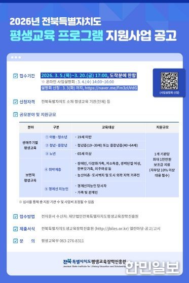 한민일보 서울포커스 박용남 기자 | 전북특별자치도평생교육장학진흥원(원장 이현웅)은 도민의 지속적인 성장과 삶의 질 향상을 위해 '2026년 전북특별자치도 평생교육 프로그램 지원사업'공모를 실시하고, 참여할 도내 평생교육 기관·단체를 모집한다.