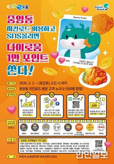 익산시는 3월 2일부터 선착순 500명을 대상으로 '중앙동 치킨로드 SNS 인증 이벤트'를 운영한다고 26일 밝혔다.
