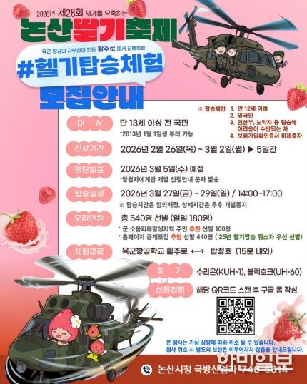 논산시가 오는 3월 개최되는 ‘제28회 논산딸기축제’의 백미(하이라이트)인‘헬기 탑승 체험’의 신청 접수를 시작한다고 전했다.