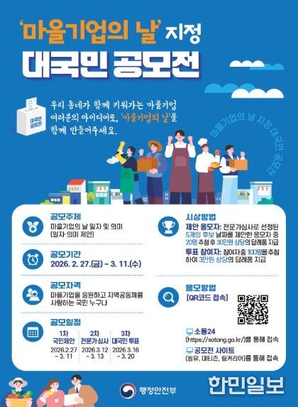한민일보 서울포커스 임철현 기자 | 행정안전부는 ‘마을기업’에 대한 국민의 이해를 높이고 마을기업 활동을 활성화하기 위해 법정기념일인 ‘마을기업의 날’의 날짜와 의미를 국민이 직접 정하는 대국민 공모를 진행한다고 밝혔다.