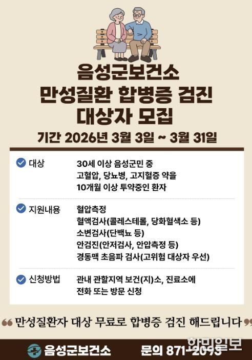 한민일보 서울포커스 김다남 기자 | 음성군보건소는 만성질환자의 합병증을 조기에 발견하고 중증 심뇌혈관질환을 예방하기 위해 3월 3일부터 31일까지 ‘2026년 만성질환 합병증 검진 사업’ 대상자를 모집한다.