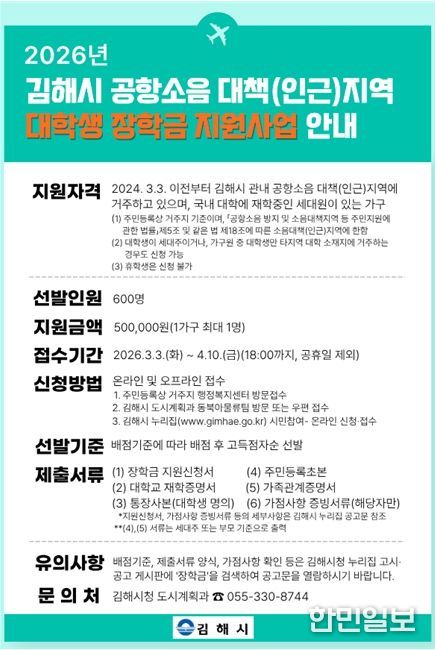한민일보 서울포커스 김은금 기자 | 김해시는 김해공항 소음대책(인근)지역 대학생을 대상 장학금 지원사업을 확대 시행한다고 밝혔다.