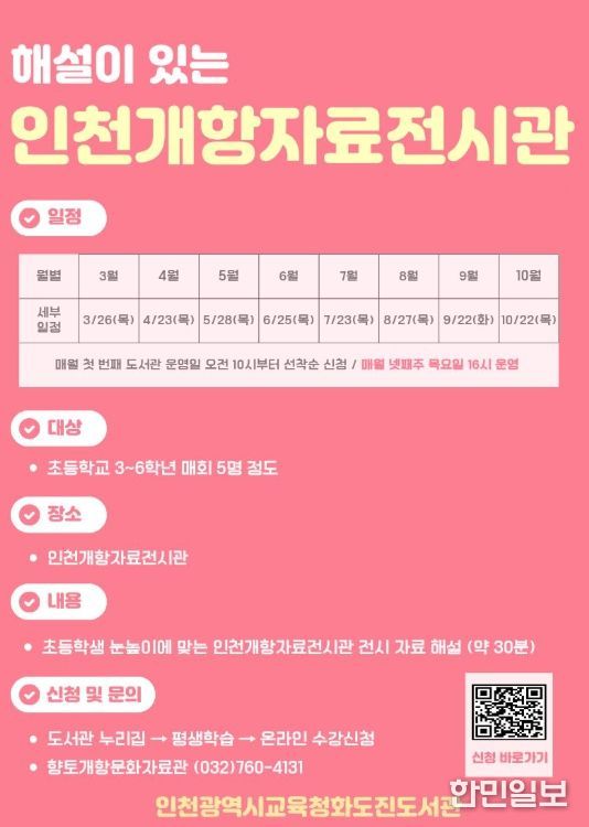 한민일보 서울포커스 유창렬 기자 | 인천광역시교육청화도진도서관은 3월부터 10월까지 관내 초등 3~6학년을 대상으로, 향토 문화와 역사의 가치를 알리기 위한 ‘인천개항자료전시관’전시 해설 프로그램을 운영한다.