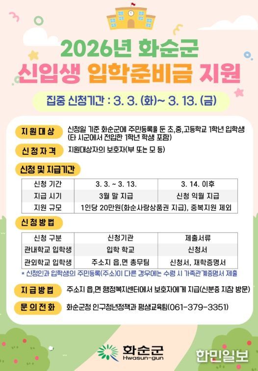 한민일보 서울포커스 박용남 기자 | 화순군은 2026학년도 초‧중‧고등학교 신입생 가정의 교육비 부담을 완화하고 보편적 교육복지를 실현하기 위해 입학준비금 1인당 20만 원을 화순사랑상품권으로 지원한다고 27일 밝혔다.