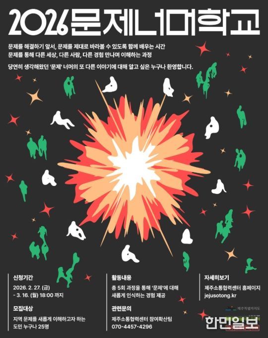 한민일보 서울포커스 임경복 기자 | 제주특별자치도와 제주특별자치도 소통협력센터가 도민 주도의 지역문제 탐구를 지원하는 교육 프로그램 ‘2026 문제너머학교’를 운영하고, 27일부터 3월 16일까지 참여자를 선착순으로 모집한다.