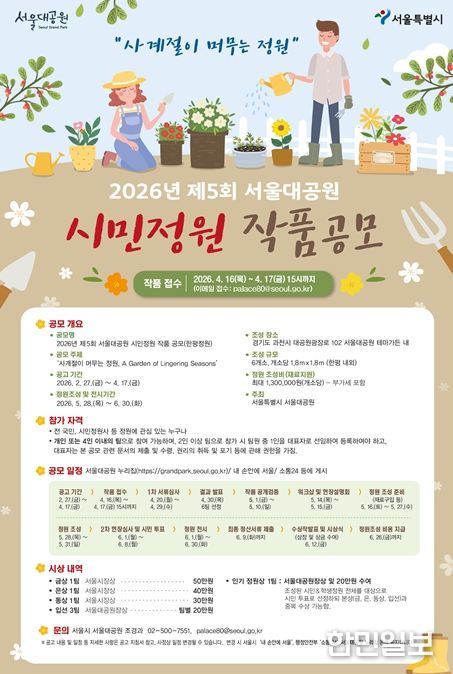 한민일보 서울포커스 국용호 기자 | 서울대공원은 시민이 직접 정원을 설계하고 가꾸며 정원문화를 확산하는 ‘2026년 제5회 시민참여정원 작품 공모전’을 개최한다.