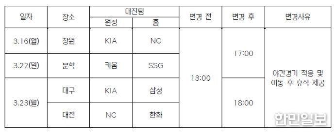 한민일보 서울포커스 최성훈 기자 | 2026 KBO 시범경기 중 일부 경기의 개시 시간이 야간경기 적응 및 이동 후 휴식 제공을 위해 변경됐다.