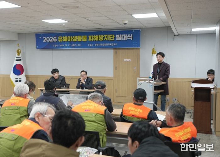 춘천시는 27일 시청 다목적회의실에서 2026년 유해야생동물 피해방지단 발대식을 열었다. 이날 발대식은 신규 위촉된 방지단과의 간담회를 비롯해 안전교육 홍보물을 배부했다.