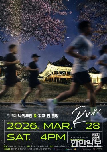 한민일보 서울포커스 김은금 기자 | 밀양문화관광재단은 오는 3월 28일 삼문동 밀양강 둔치 일원에서 벚꽃 철을 맞아 지역 야간관광 활성화를 위한 이색 러닝 축제 ‘제3회 나이트 런 앤 워크 인 밀양(Night Run & Walk in Miryang)’을 열고, 3월 22일까지 참가자를 모집한다.