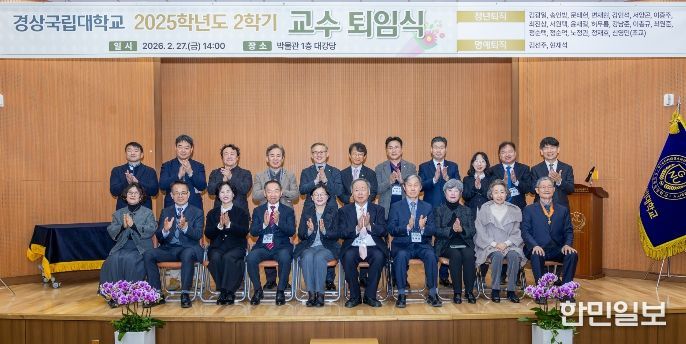 한민일보 서울포커스 박근원 기자 | 경상국립대학교는 2월 27일 오후 2시 가좌캠퍼스 박물관 1층 대강당에서 2025학년도 2학기 교수 퇴임식을 개최했다. 교수 퇴임식은 후학양성과 대학발전을 위해 커다란 발자취를 남기고 정년을 맞아 퇴직하는 교수들의 공로를 기리기 위해 마련됐다.