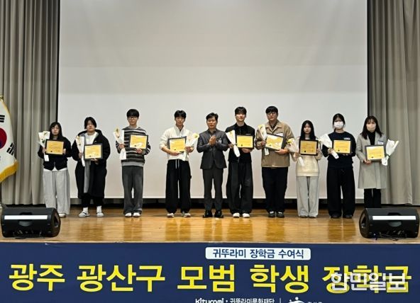 광산구에 따르면, 귀뚜라미문화재단은 이날 구청 7층 윤상원홀에서 2026년 장학금 수여식을 열고 광산구 고등학생 25명, 대학생 20명 등 총 45명에게 장학금을 전달했다.