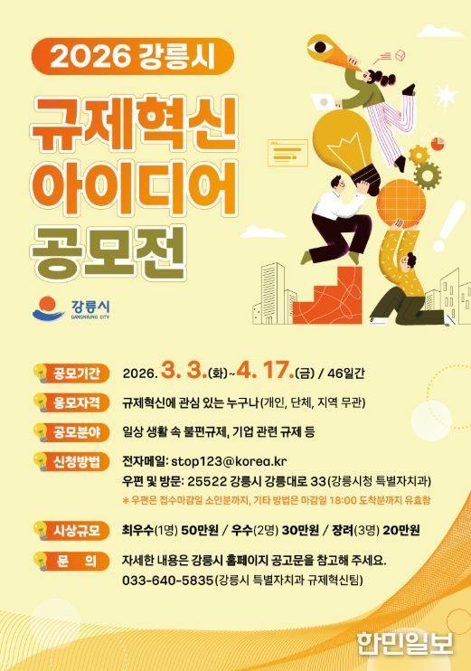 한민일보 서울포커스 임경복 기자 | 강릉시는 시민이 겪고 있는 생활 규제와 기업들이 직면하고 있는 불합리한 기업 활동 규제를 발굴·개선하기 위해 전 국민을 대상으로 규제혁신 공모전을 개최한다.