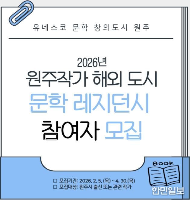 한민일보 서울포커스 임경복 기자 | 유네스코 문학 창의도시인 원주시는 지역 문학인의 창작활동 지원과 국제 교류 확대를 위해 ‘원주작가 해외 도시 문학 레지던시’ 참여 희망 작가를 4월 30일까지 모집한다.