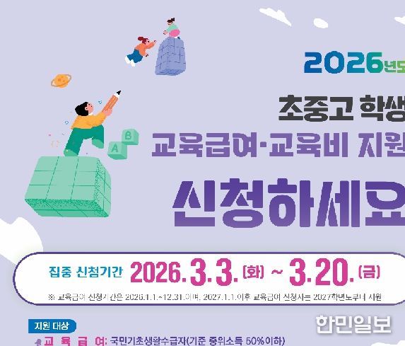 한민일보 서울포커스 유한희 기자 | 대전시교육청과 동·서부교육지원청은 3월 3일부터 3월 20일까지 저소득층 가정을 대상으로 ‘2026학년도 초·중·고 학생 교육급여 및 교육비 집중 신청 기간’을 운영한다고 밝혔다.