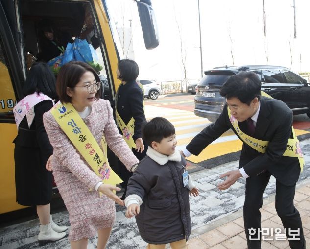 이날 김대중 교육감은 등원하는 유아 한 명 한 명을 반갑게 맞이하고 학부모와 인사를 나눴다. 교직원들과 실내·외 시설을 둘러보며 현장 의견도 청취했다.