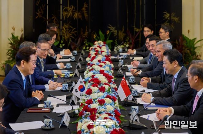 한민일보 서울포커스 김윤이 기자 | 싱가포르를 국빈 방문 중인 이재명 대통령은 3월 2일 오전 '로렌스 웡(Lawrence Wong)' 싱가포르 총리와 정상회담을 갖고 양국 간 전략적 동반자 관계 심화 방안과 한반도 및 중동정세 등 주요 국제 현안에 대해 폭넓게 논의했다.