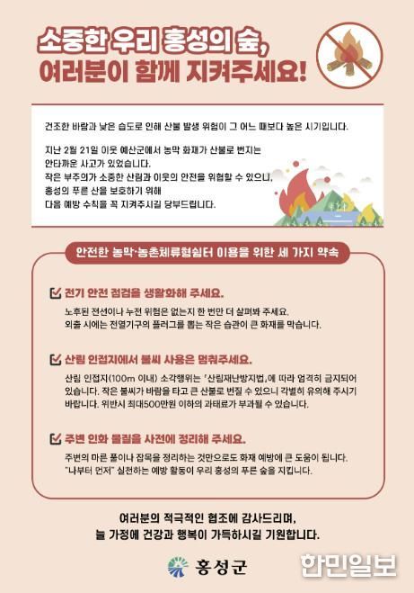 홍성군은 이번 조치를 계기로 산림 인접 시설 중심의 자율 안전관리 체계를 강화하고, 지속적인 홍보와 점검을 병행해 화재 위험 요인을 사전에 관리해 나갈 계획이다.