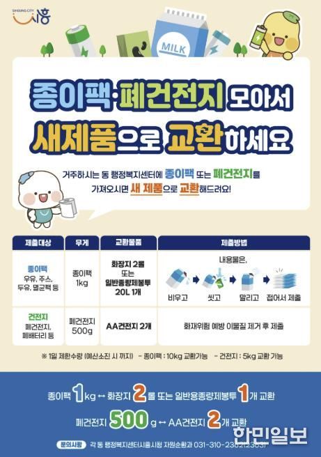 한민일보 서울포커스 유현민 기자 | 시흥시는 생활 속 자원순환 문화 확산을 위해 종이팩 교환 사업을 지속 추진하는 한편, 올해부터 폐건전지 교환 사업을 확대 시행한다.