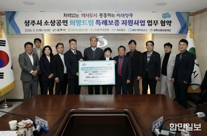 한민일보 서울포커스 김봉순 기자 | 상주시가 3월 3일 관내 금융기관과 ‘소상공인 희망드림 특례보증 매칭출연 협약’을 체결하고 지역 소상공인에 대한 금융지원 확대에 나섰다.