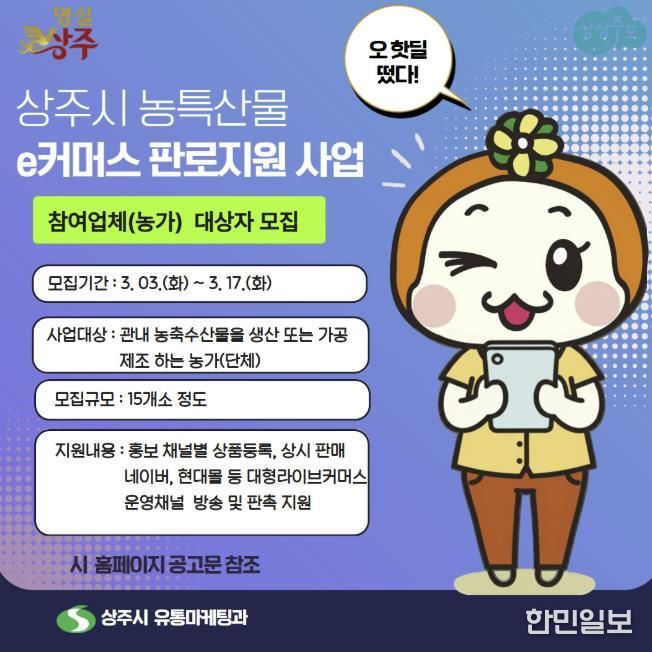 한민일보 서울포커스 김봉순 기자 | 상주시가 지역 농특산물의 온라인 판로확대와 브랜드 인지도 제고를 위해 녪년 상주시 농특산물 e-커머스 판로지원 사업’을 추진하고 3월 3일 부터 3월 17일까지 15일간 사업대상자를 모집한다고 밝혔다.
