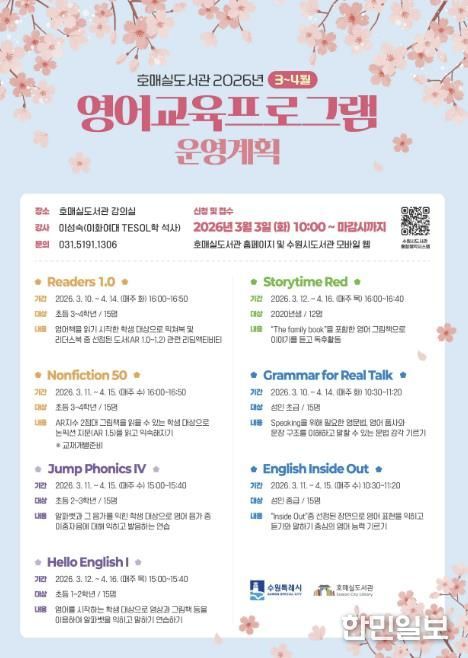 한민일보 서울포커스 진광성 기자 | 수원시 호매실도서관이 ‘3~4월 영어교육 프로그램’ 참가자를 모집한다. 이성숙 강사(이화여대 테솔(TESOL)학 석사)가 강의한다.