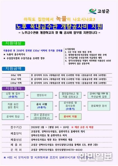 한민일보 서울포커스 김은금 기자 | 고성군은 급수관 노후로 내부가 부식되어 녹물 출수 등으로 인한 수돗물 사용에 큰 불편을 겪고 있는 세대에 옥내급수관 개량공사비를 지원한다고 밝혔다.