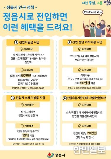 먼저 시는 타 지자체에서 정읍으로 터전을 옮기는 시민들을 위해 전입지원금을 대폭 상향했다. 기존 15만원이었던 지원금을 최대 50만원으로 확대해 전입 후 6개월이 지나면 20만원, 1년이 경과하면 30만원 등 총 2회에 걸쳐 정읍사랑상품권으로 지급한다. 변경된 제도는 2025년 7월 1일 이후 전입자부터 적용된다.