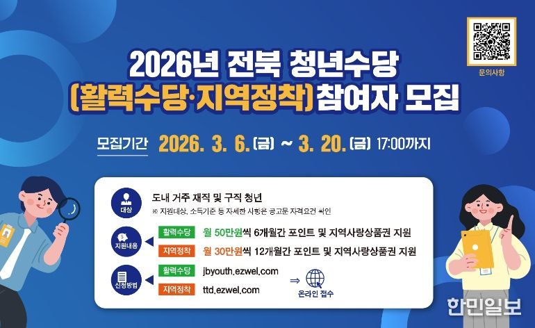 한민일보 서울포커스 박용남 기자 | 김제시는 관내 미취업 청년의 구직활동을 지원하고 경제적 부담을 완화하기 위해 '2026년 전북형 청년활력수당' 참여자 75명을 모집한다고 밝혔다.