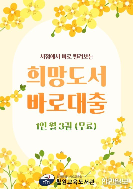 한민일보 서울포커스 곽중희 기자 | 철원교육도서관은 3월부터 철원 관내 지역 서점 2곳과 함께 ‘희망도서 서점 바로대출 서비스’를 운영한다.