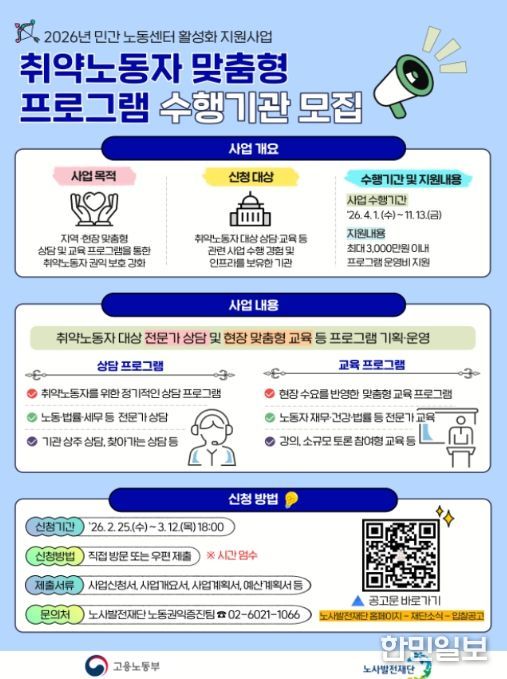 한민일보 서울포커스 임경복 기자 | 고용노동부 노사발전재단은 민간 노동센터·비영리단체 등이 지역별 특성과 취약노동자의 다양한 노동환경을 반영한 맞춤형 프로그램을 기획·운영할 수 있도록 '2026년 취약노동자 맞춤형 프로그램' 지원 사업을 추진한다고 밝혔다.