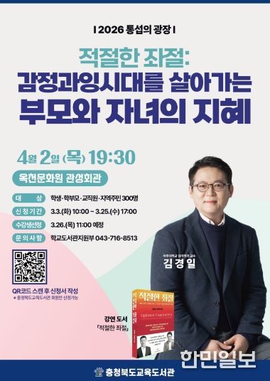 강연은 4월 2일 19시 30분, 옥천문화원 관성회관에서 진행되며, 학생, 학부모, 교직원, 지역주민 등 누구나 신청할 수 있다. 강연 신청은 3월 3일 오전 10시부터 3월 25일 오후 5시까지 충청북도교육도서관 누리집을 통해 가능하다.