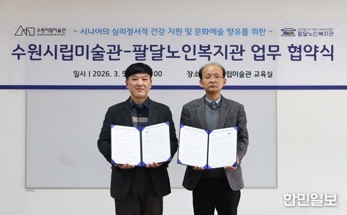 수원시립미술관에서 열린 협약식에는 남기민 수원시립미술관장, 윤학수 팔달노인복지관장을 비롯한 양 기관 관계자들이 참석했다. 두 기관은 이번 업무협약을 계기로 지역 시니어의 심리ㆍ정서적 건강을 지원하고 문화예술 참여를 확대하기 위한 협력 체계를 구축하기로 했다.