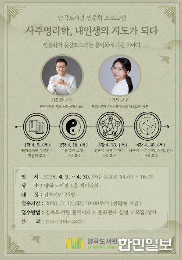 한민일보 서울포커스 임경복 기자 | 김포시 양곡도서관은 오는 4월 9일부터 4월 30일까지 매주 목요일, 인문학 강좌 '사주명리학, 내 인생의 지도가 되다'를 운영한다.