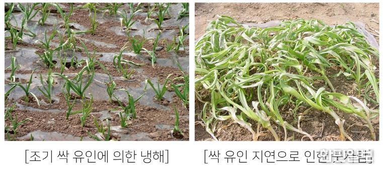 마늘 싹 유인 작업이 지연될 경우 멀칭 내부 온도 상승으로 인해 잎이 웃자라고 연약해져 고온과습 피해 및 병해충 발생으로 수량이 최대 30%까지 감소한다. 반대로 시기가 너무 빠르면 저온에 의한 냉해 피해로 수량이 10~15% 줄어든다.