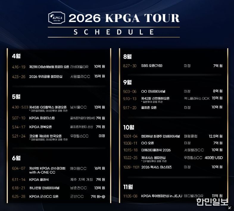 한민일보 서울포커스 최성훈 기자 | ㈜한국프로골프투어(대표이사 김원섭, 이하 KPGT)가 3월 5일, 2026 시즌 KPGA 투어 일정을 발표했다.