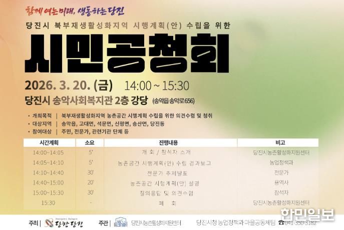 한민일보 서울포커스 임경복 기자 | 당진시는 오는 20일 오후 2시 송악사회복지관(송악읍 송악로 656)에서 북부농촌재생활성화지역*을 대상으로 수립한‘농촌 공간 재구조화 및 재생 시행계획(안)’에 대한 공청회를 개최한다고 6일 밝혔다.