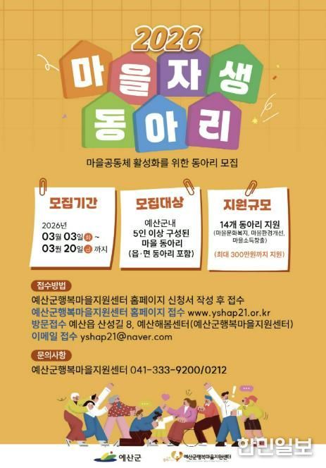 한민일보 서울포커스 임경복 기자 | 예산군행복마을지원센터는 마을에 활력을 불어넣고 마을공동체 회복을 도모하기 위해 2026년 마을자생동아리를 3월 20일까지 모집한다고 밝혔다.