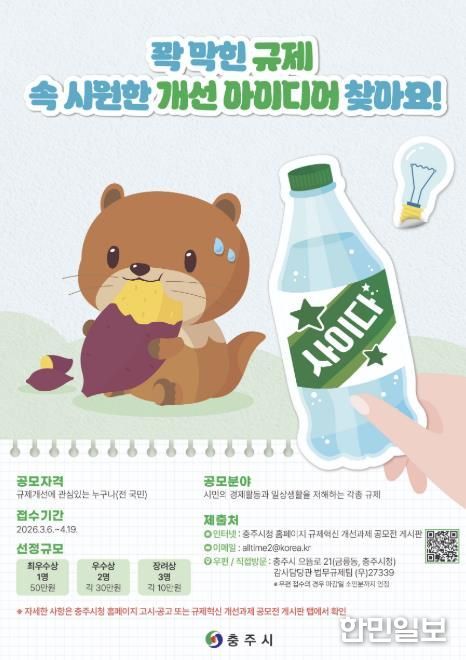 한민일보 서울포커스 김다남 기자 | 충주시는 시민의 일상과 경제활동을 불편하게 만드는 각종 규제를 발굴 ·개선하기 위해 ‘2026년 규제혁신 개선과제 공모전’을 개최한다고 6일 밝혔다.
