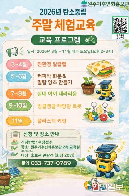 한민일보 서울포커스 임경복 기자 | 원주기후변화홍보관은 시민들이 생활 속에서 탄소중립을 쉽고 재미있게 이해하고 실천할 수 있도록 ‘탄소중립 주말 체험교육 프로그램’을 운영한다.