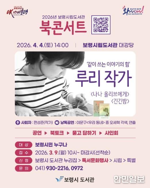 한민일보 서울포커스 임경복 기자 | 보령시는 4월 4일 토요일 오후 2시 보령시립도서관 대강당에서 베스트셀러 『긴긴밤』의 저자 루리 작가를 초청해 북콘서트를 개최한다고 밝혔다.