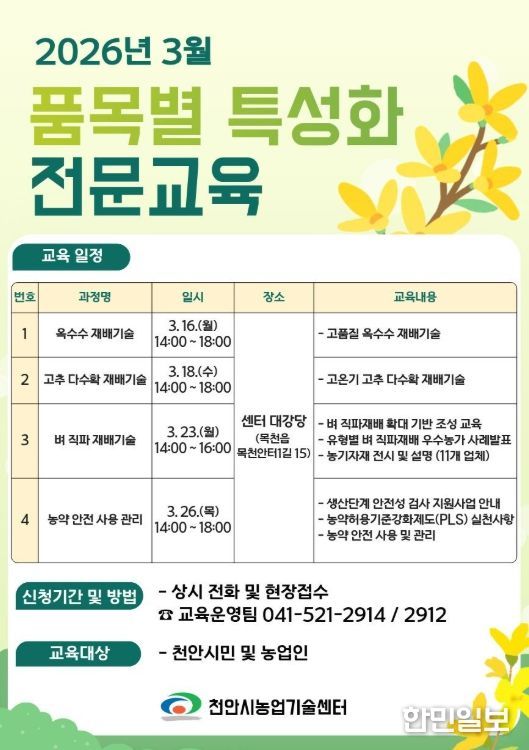 한민일보 서울포커스 황준형 기자 | 천안시농업기술센터는 본격적인 영농철을 앞두고 ‘품목별 특성화 전문교육’을 운영한다고 6일 밝혔다.